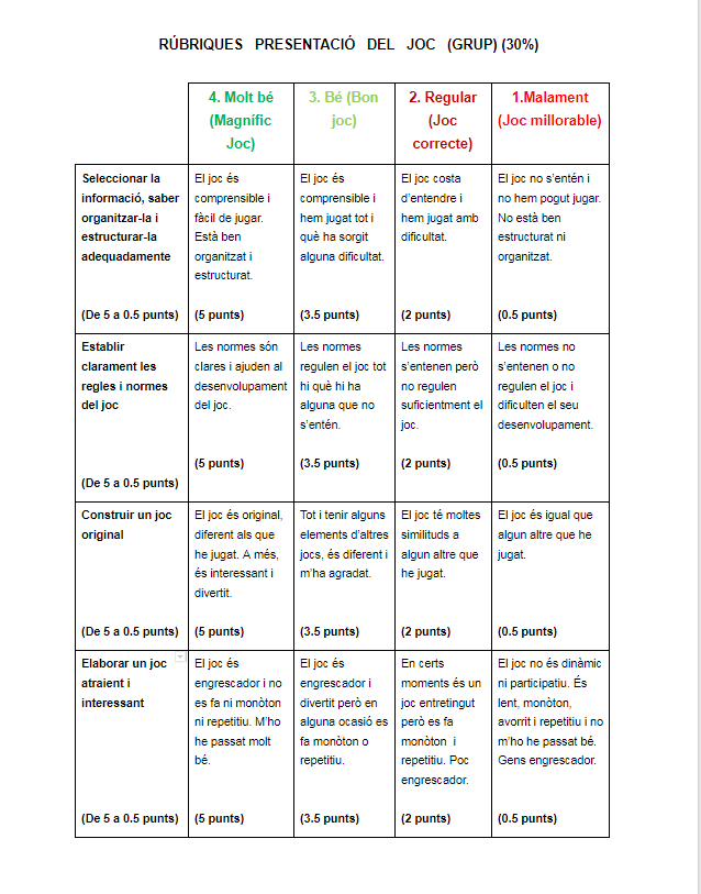 - Registre d’avaluació de la presentació del joc i normes de funcionament: es realitza en una rúbrica de “Presentació del joc”.