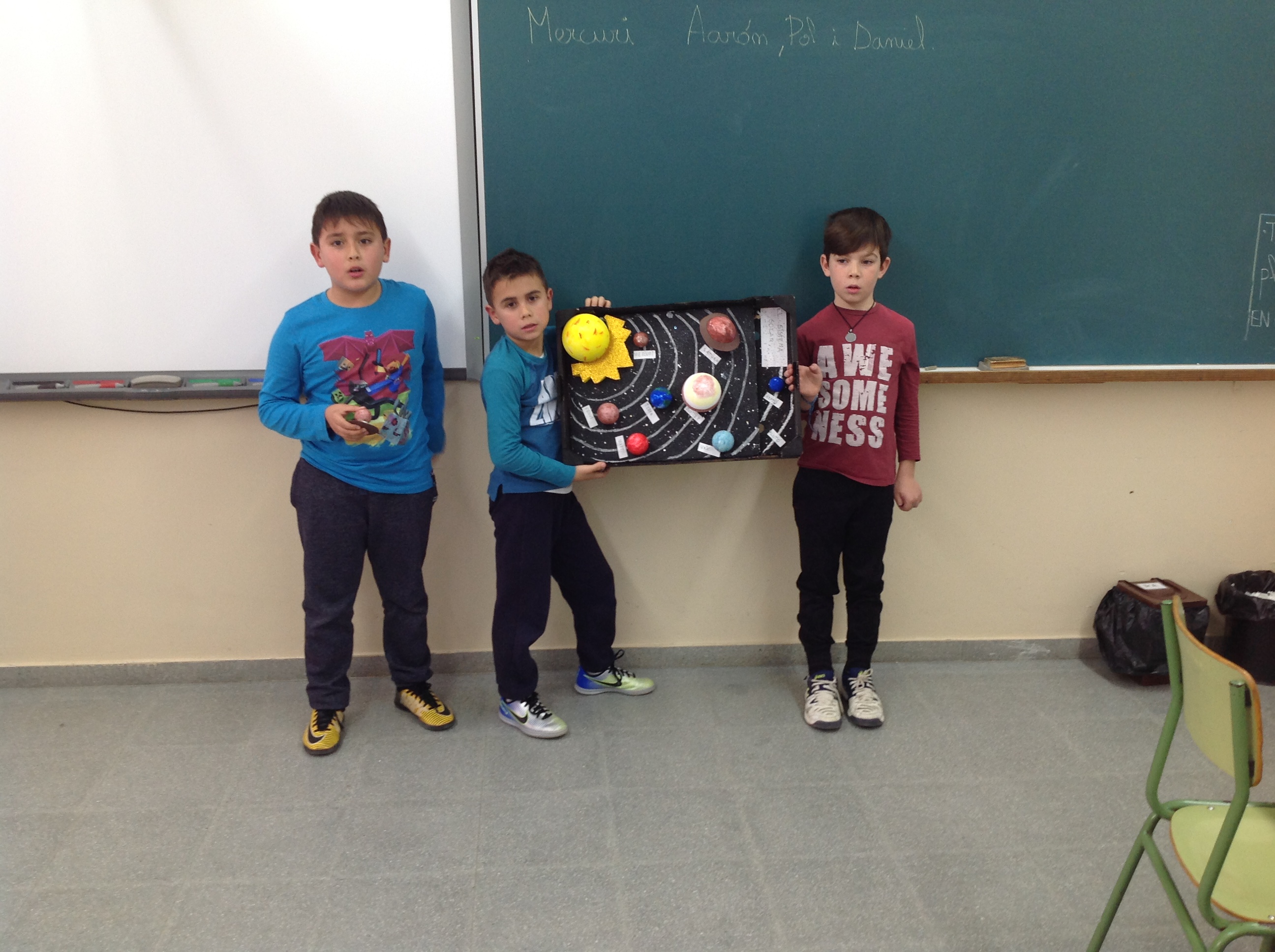 A partir d’aquí va sorgir la idea de treballar aquest tema dels planetes com a projecte. Va ser un treball cooperatiu, els alumnes triaven els grups i també el planeta a estudiar. Però hi havia uns planetes molt sol·licitats (Saturn) i en canvi d’altres gens (La Terra), amb la qual cosa, les mestres van tenir que intervenir i repartir equitativament els planetes a treballar.