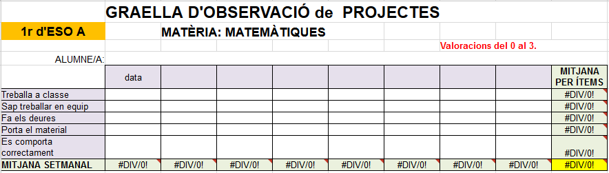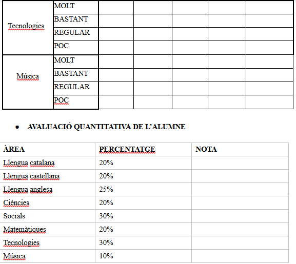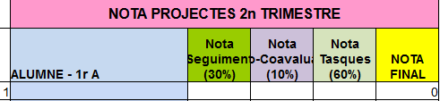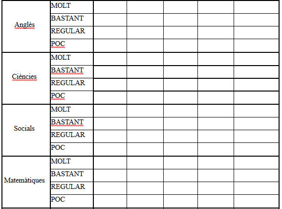 Aquest resultat quedarà reflectit en una graella compartida. Cada una de les matèries omplirà la següent graella, tenint en compte el resultat del seguiment i l’auto i coavaluació, a més de les tasques que s’han anat entregant/realitzant.