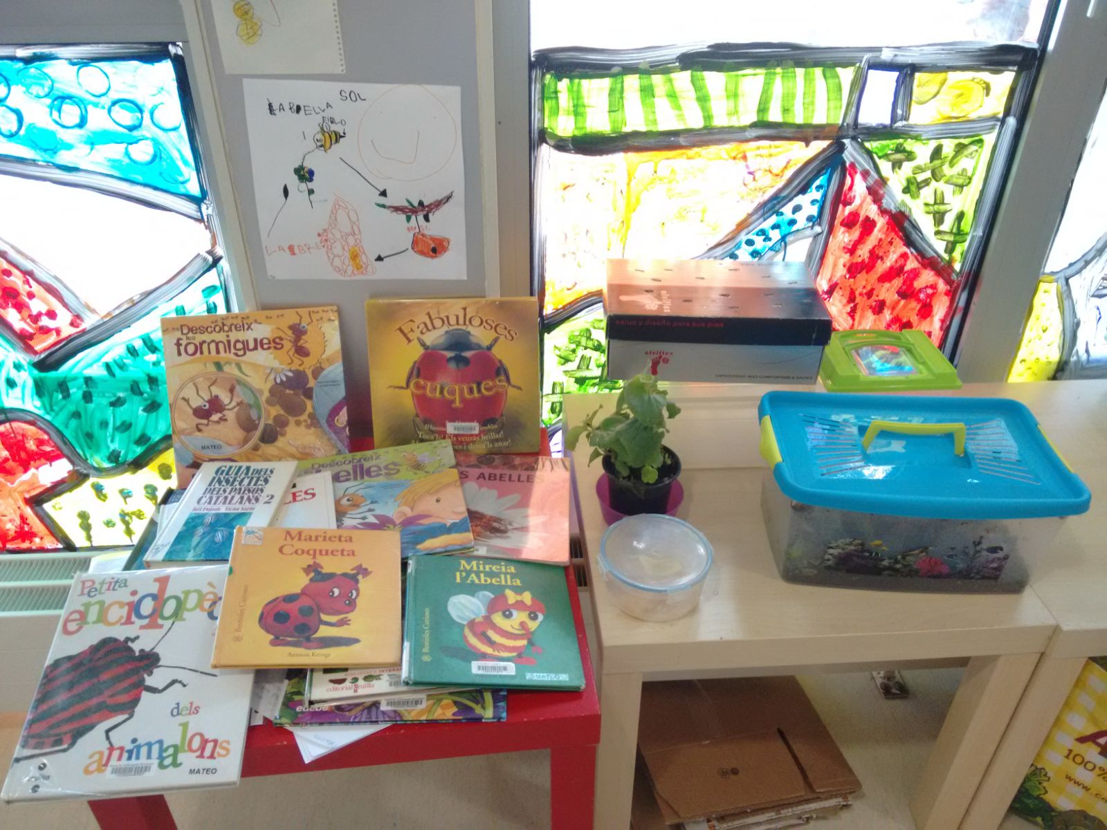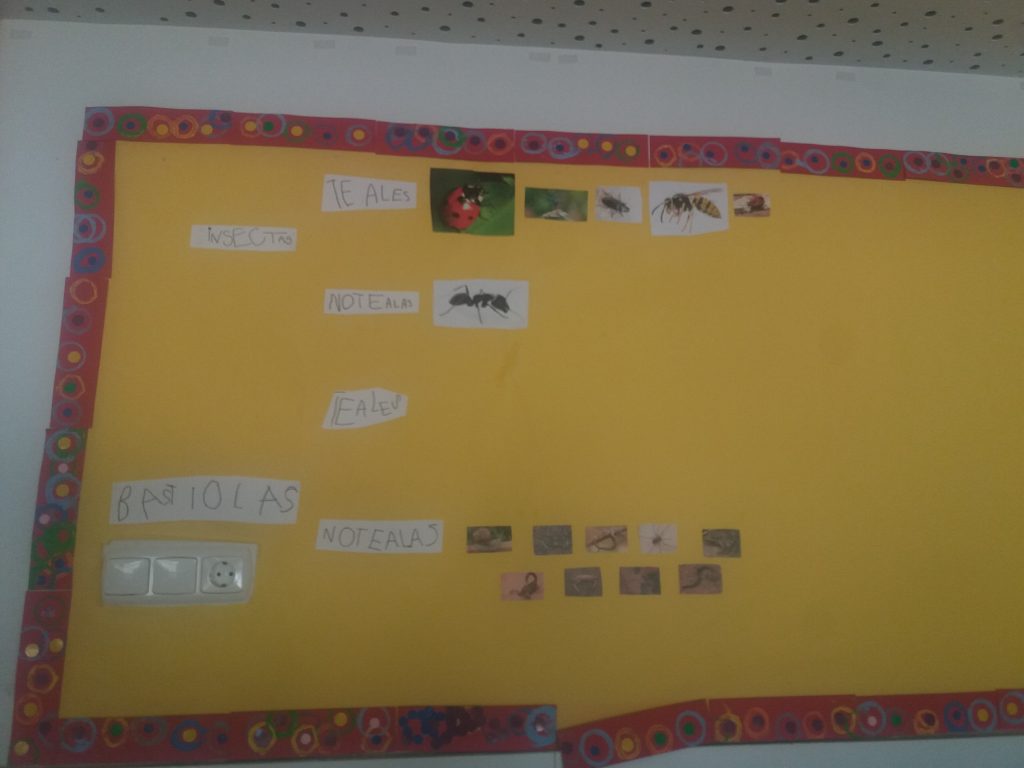 Han portat molts contes, petits murals i fins i tot terraris amb insectes i bestioles vives, això ens ha donat peu a investigar quins són insectes i quins no. a traves de la informació dels llibres hem descobert que els insectes han de tenir cos, tòrax i abdomen, quatre ales, dues antenes i sis potes. Tenim encara dubtes, per què hi ha algunes formigues que tenen a ales i altres no. Investigarem…