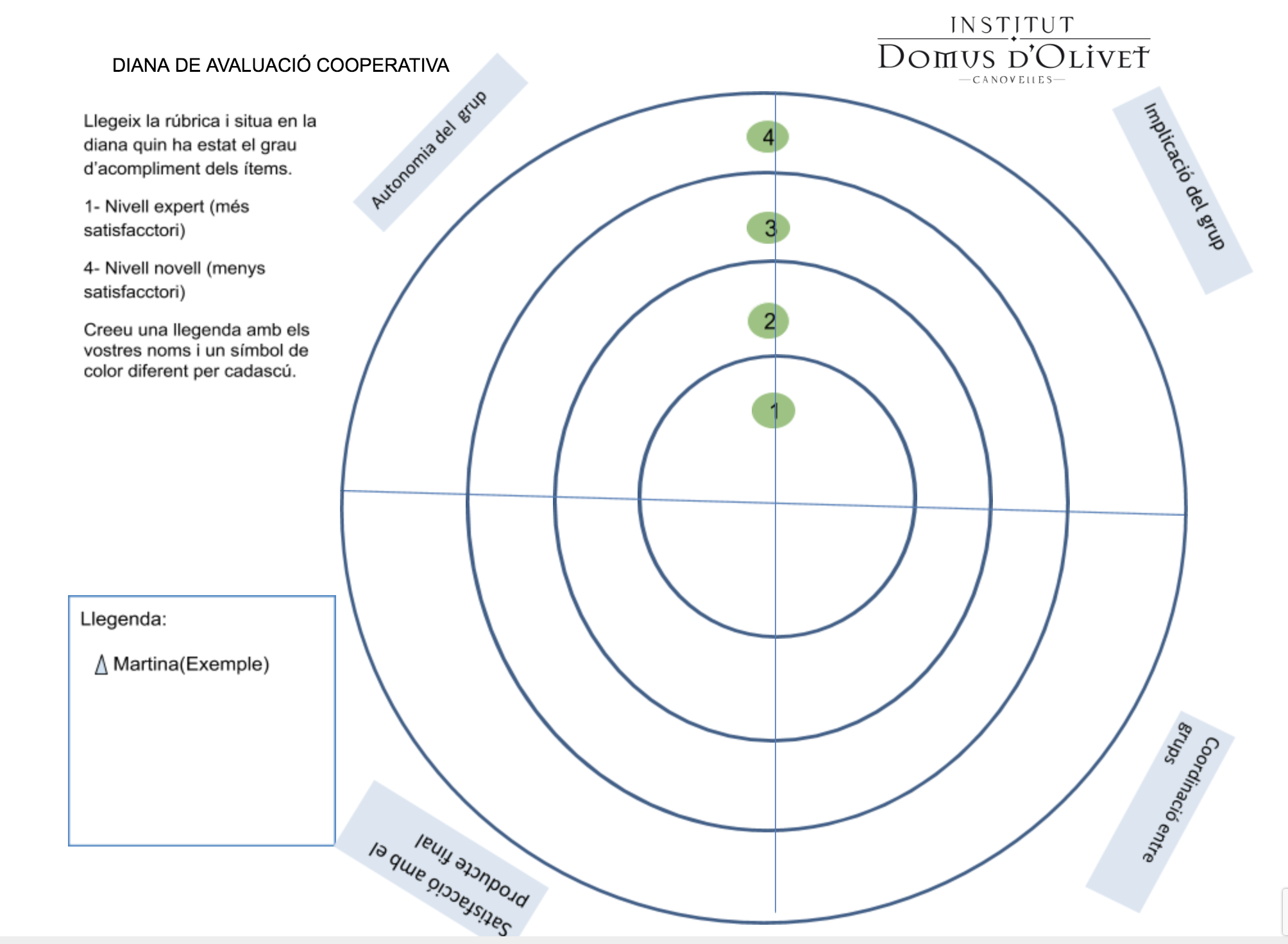 Els vam demanar que fessin una autoavaluació a partir de l’esquema de diana que mostra el document adjunt. El primer que cal destacar és la sinceritat amb què van respondre, ja que cadascú va ser conscient dels seus punts febles i forts i dels dels altres.
