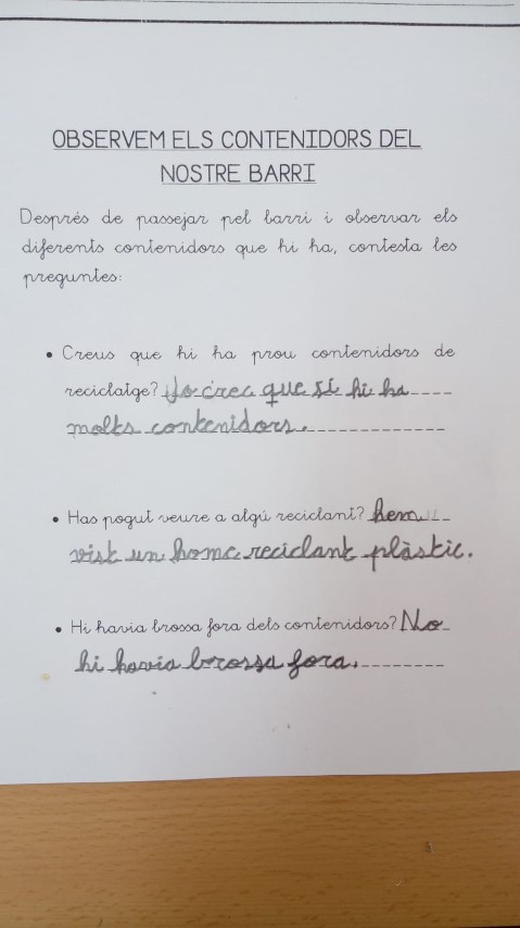 Decidides i decidits, hem anat a fer una volta pel barri per tal d’observar quants contenidors de reciclatge hi ha al nostre voltant (alguns de vells i d’altres molt nous), ens hem fixat si algú reciclava i si havia brossa pel terra. Al tornar a l’escola hem arribat a la conclusió que al barri de Llefià hi ha molts contenidors de reciclatge i que la gent no llença brossa a fora.
