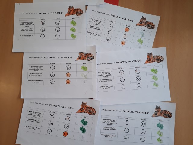 S’ha deixat constància de tot allò que hem après al racó de la classe dedicat al projecte dels tigres, de manera que s’ha confeccionat un esquema visual amb rètols i imatges per tal de tenir un recordatori de tot allò que junts hem anat descobrint. També s’han realitzat tasques individuals i produccions plàstiques.