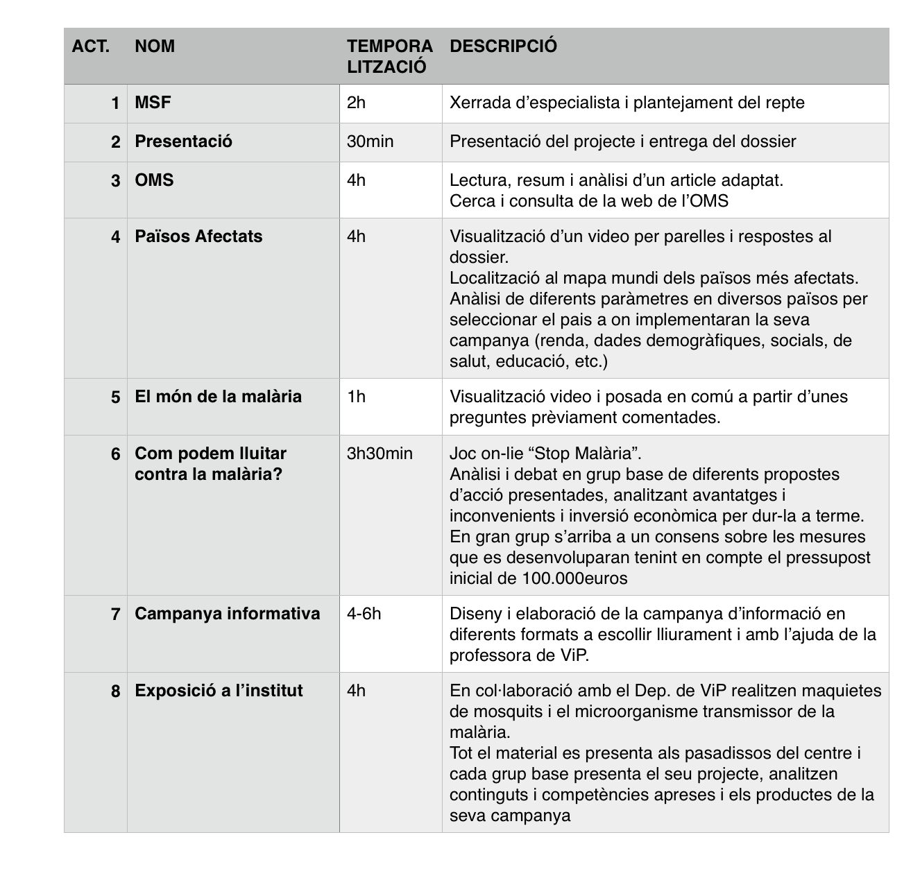 El repte inicial parteix d’un problema real com és la malària al món i les seves conseqüències, fa reflexionar sobre la relació entre algunes malalties i aspectes com la distribució geogràfica i la situació socio-econòmica d’alguns països, fa plantejar-se les desigualtats al món i ens dona l’oportunitat de crear solucions múltiples a la pregunta inicial…Com podem combatre la malària?