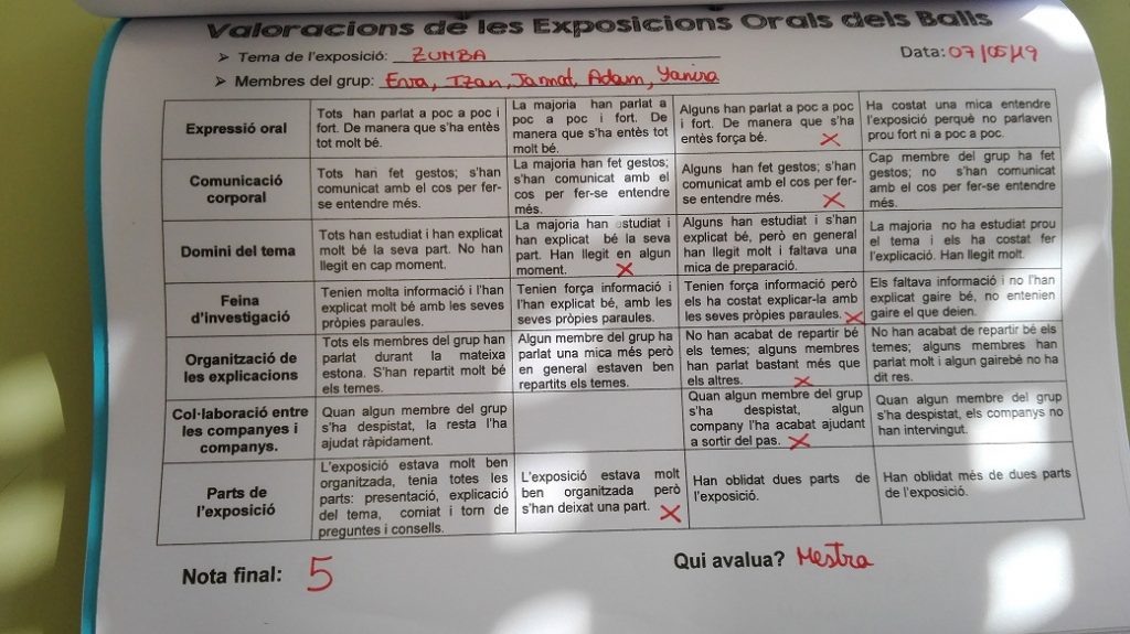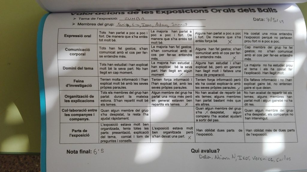 Així, ja des d’aquell moment, estaven ubicats i coneixien  el que s’avaluaria. Vam decidir també les eines : una rúbrica del funcionament del grup cooperatiu i una reflexió personal posterior a una conversa conjunta.