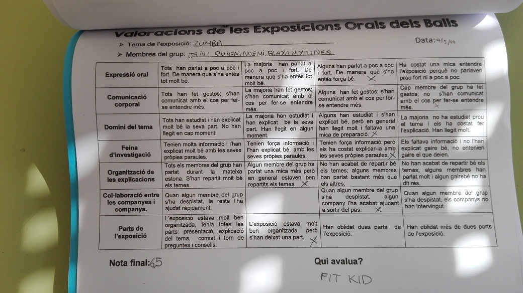 Així, ja des d’aquell moment, estaven ubicats i coneixien  el que s’avaluaria. Vam decidir també les eines : una rúbrica del funcionament del grup cooperatiu i una reflexió personal posterior a una conversa conjunta.