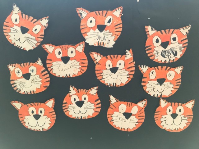 B. Decorem amb màscares de tigres el nostre passadís. Després de saber com és la cara dels tigres, donem color al nostre passadís amb les originals caretes de tigres que cadascú fa. Així tothom en passar sabrà qui habita a l’aula del costat.