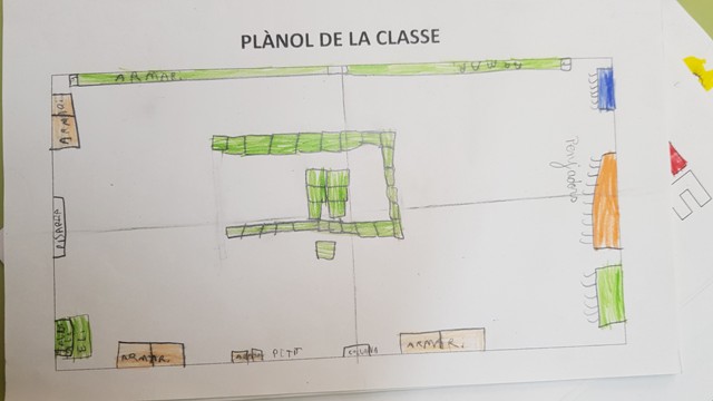 A la primera sessió se’ls hi va plantejar als alumnes realitzar el canvi de l’organització de la classe mitjançant un plànol, a partir d’aquí es va començar a parlar sobre quina era la importància de comprendre i realitzar plànols o itineraris mitjançant un bon ús del llenguatge matemàtic, per exemple, entre, enmig, davant, darrere…