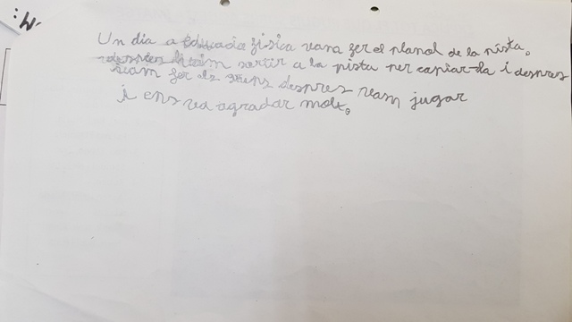 Les següents sessions es van fer juntament amb la mestra d’educació física. Ens vam coordinar ja que al cicle inicial es treballen de forma autònoma els racons d’aquesta àrea, per tal de treballar transversalment amb tots els àmbits de coneixement. Se’ls hi va proposar organitzar i realitzar aquest plànol que veieu a la fotografia, i posteriorment havien d’explicar com ho havien fet en petit grup.