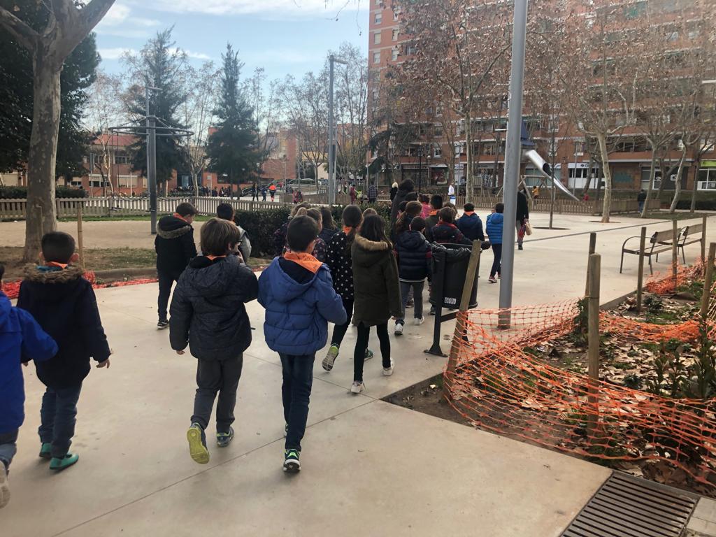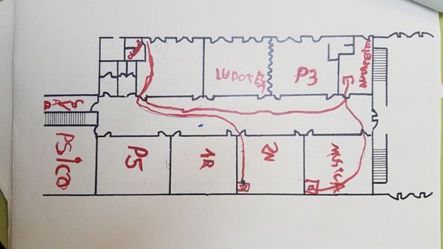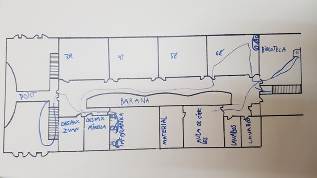 Després de situar els espais, a les següents sessions, amb els mateixos grups havien de seguir dos itineraris, un vermell i un blau, i seguir les indicacions que els hi marcava. Els itineraris passaven per totes les aules de l’escola que havíem parlat anteriorment.