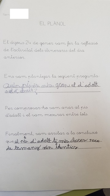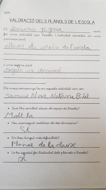 Un cop treballats els conceptes de la localització i realització d’itineraris o plànols sobre ells mateixos respectant el vocabulari bàsic de relacions espacials, vam encetar un nou repte que va ser si sabien situar els espais de l’escola. Es va donar a cada grup un plànol buit i una llista amb els espais que havien de trobar i localitzar.