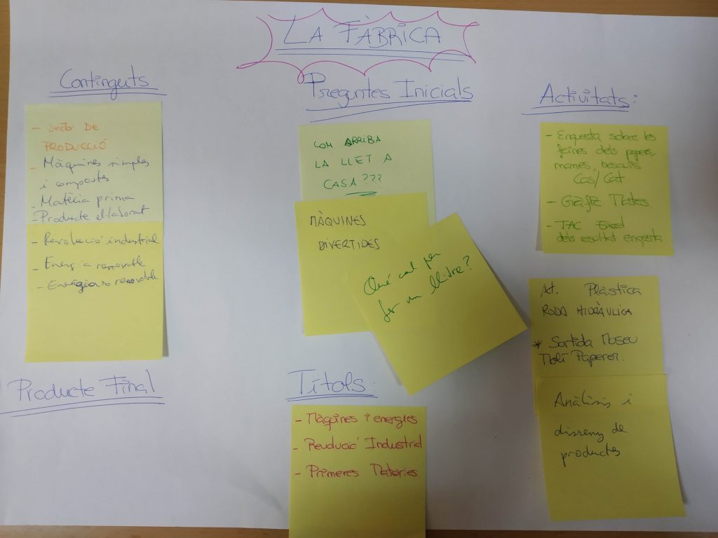 A la nostra escola tenim franges de treball interdisciplinari on treballem el medi social. A quart, els alumnes fan una sortida al molí Paperer a Capellades. A partir d’aquí comença un projecte basat en les màquines. A Xarxes hem decidit agafar aquest projecte i redactar-lo formalment, ampliar-lo i donar-li forma. L’inici va ser un brain storming on vam abocar tot el que pensàvem que podia estar relacionat. Aquí teniu la fotografia de la nostra pluja d’idees.