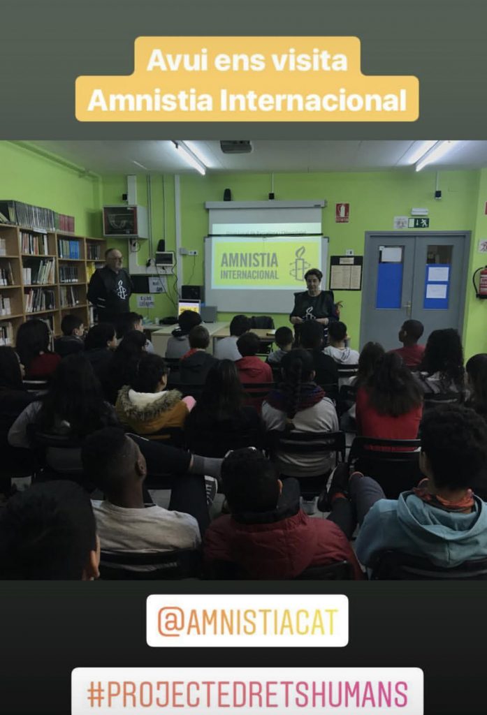 Amb aquest projecte també han pogut pintar un mural al pati tots els alumnes de primer d’ESO que posa: DRETS HUMANS!!! S’ho han passat d’allò mes bé!