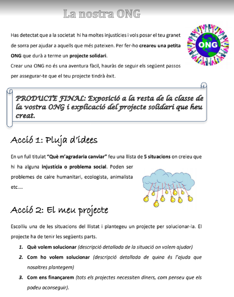 Com a producte final d’aquesta primera part del projecte han creat en grups “ La Nostra ONG “. Han pensat quin tipus de problema volen ajudar a solucionar i maneres de fer arribar el seu missatge a la resta i com es poden finançar. Han acabat donant a conèixer les seves Ongs a la resta de companys.. Han preparat uns Powerpoints i els ha exposat als seus companys/es.