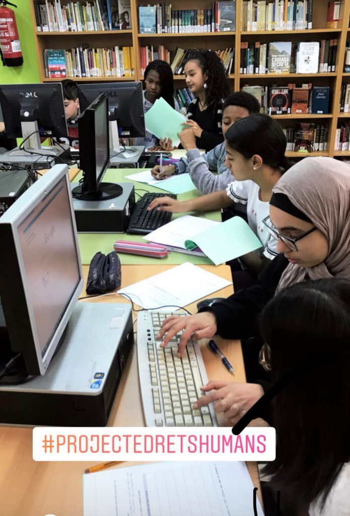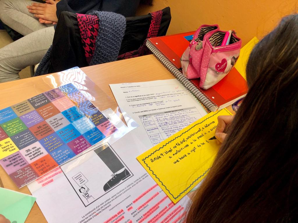 La conexió amb la Declaració Universal del Drets Humans ha estat el següent pas del procés.Tots tenim dret a tenir unes mínimes condicions per viure d’una manera digna, a tenir els mateixos drest, a viure en llibertat… . A partir d’aquí han treballat els 30 drets de la declaració universal en català i en anglès. N’han escollit uns quants i han elaborat uns murals que han penjat als suros del passadís de primer.