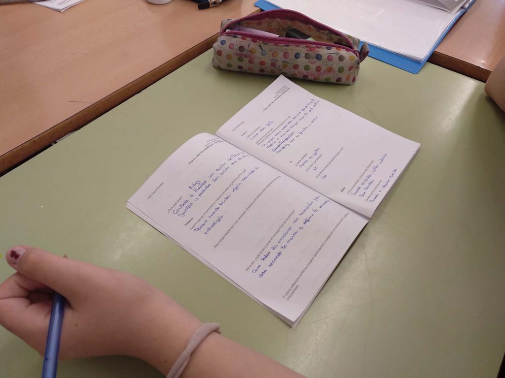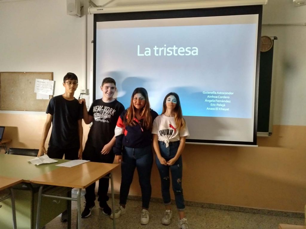 En tornar del pati es fa l’activitat de l’art i les emocions.  Es tracta primer de fer reflexionar als alumnes sobre les emocions que els transmeten diferents recursos audiovisuals, des de pintures, curtmetratges, fotografies, música, …  I després, la segona part de l’activitat, es fan una sèrie de preguntes sobre com estan encarant el seu producte final. I acaben la sessió del dia fent treball en equip i omplint el diari del grup.