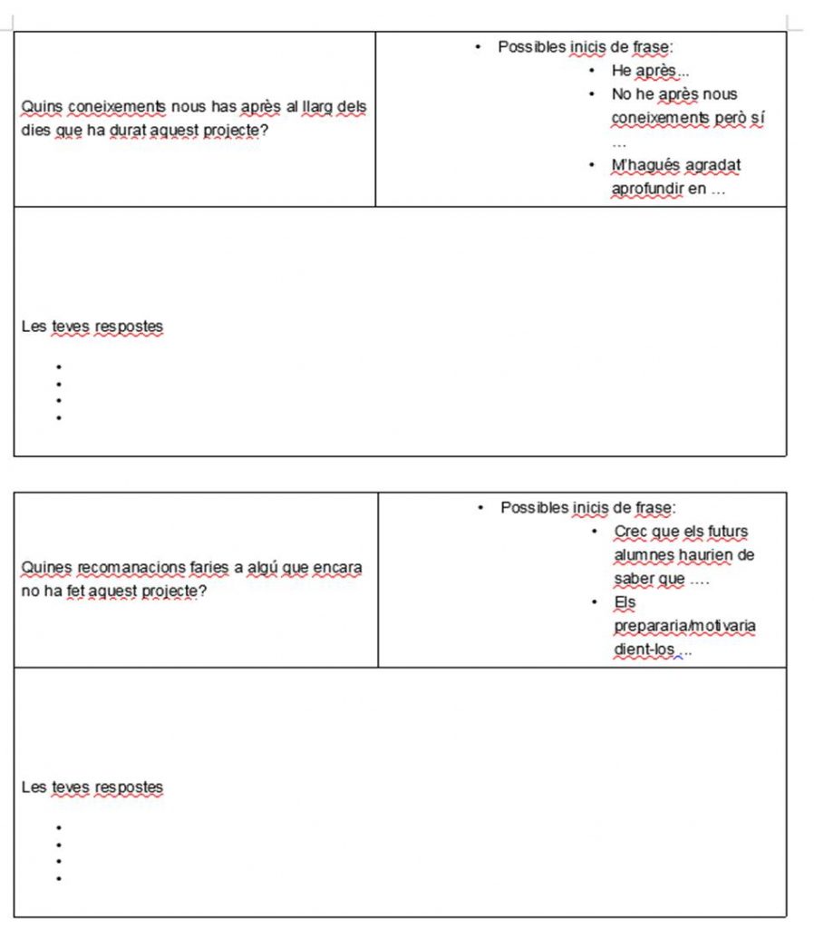 Després de llegir i omplir la taula de la rúbrica d’avaluació, caldria respondre a les següents preguntes de la manera més sincera, reflexiva i crítica possible.