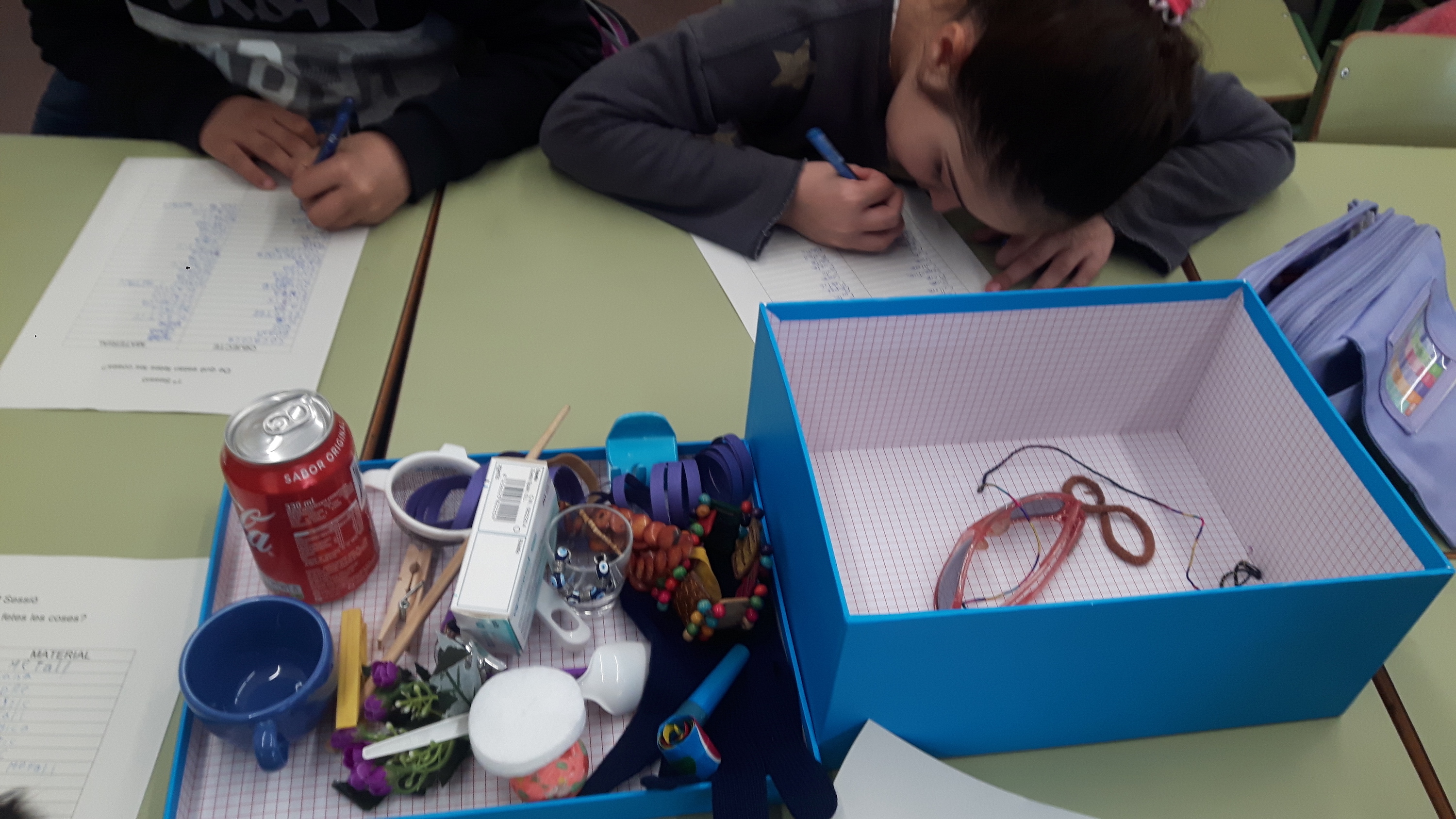 El projecte es va iniciar amb una activitat per motivar a l’alumnat i també per poder veure el nivell de coneixements del què es partia. Aquesta consistia en mostrar una caixa plena de diferents objectes, on es podien distingir diferents productes, materials i per tant matèria (foto d’aquesta entrada). Amb el plantejament de les preguntes: “Per què hi ha objectes dins la caixa?”, “Què tenen en comú?” o “Quina relació hi ha entre ells?”, els alumnes van anar contestant i relacionant els objectes i els seus materials, per acabar entenent que el projecte anava de la matèria.