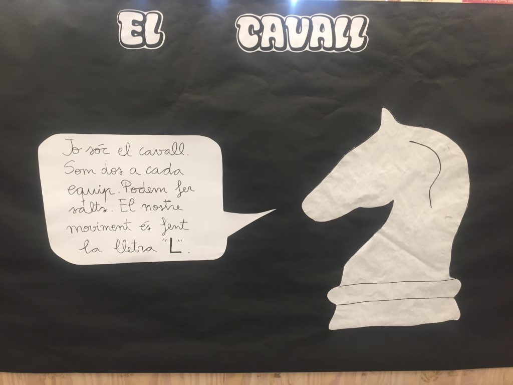 Un cop contestada aquesta pregunta, per grups han buscat la informació sobre una peça d’escacs que van plasmar en un mural. En aquest mural hem escrit la descripció de la peça i també el moviment que feia cada peça en el joc dels escacs. Aquesta informació l’hem explicat a la resta de companys d’aula, després als companys de nivell i finalment als de cicle. Aquests murals els hem exposat a les parets de cada aula, visible per a tot l’alumnat de l’escola.