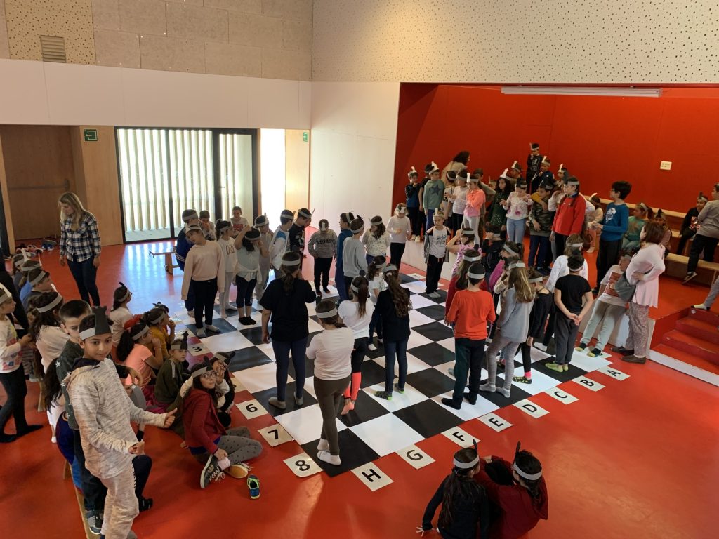 El producte final ha estat jugar a una partida d’escacs vivents. Cada jugador ha tingut una diadema amb el dibuix d’una figura. Com que no tots els alumnes han pogut tenir el rol de “jugador”, des de fora el taulell gegant la resta d’alumnes han tingut el rol d’estrategues”: han hagut de pensar la jugada i la tàctica.