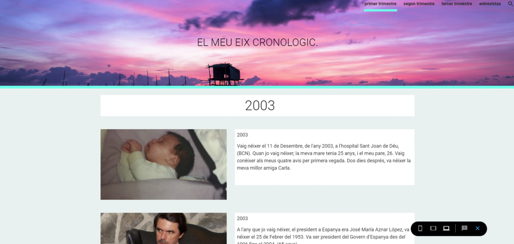 A partir d’aquestes premisses vam decidir que cada un d’ells creés el seu propi i personal eix cronològic. Es tractava de dividir els seus 15 anys de vida en 3 trimestres i treballar 5 anys per trimestre, de manera que a final de curs haguessin treballat els darrers 15 anys de la nostra societat i haguessin fet una reflexió també sobre la seva vida. I és que per a cada any havien d’incloure informacions d’àmbits diversos i també de la seva vida personal. La informació podia ser presentada manualment, en un google site o bé amb una presentació tipus powerpoint. Els continguts havien d’incloure les dues llengües en la proporció que ells consideressin adequada. L’exposició oral havia de ser per força en català perquè és la llengua que la majoria d’aquest alumnat menys domina.
