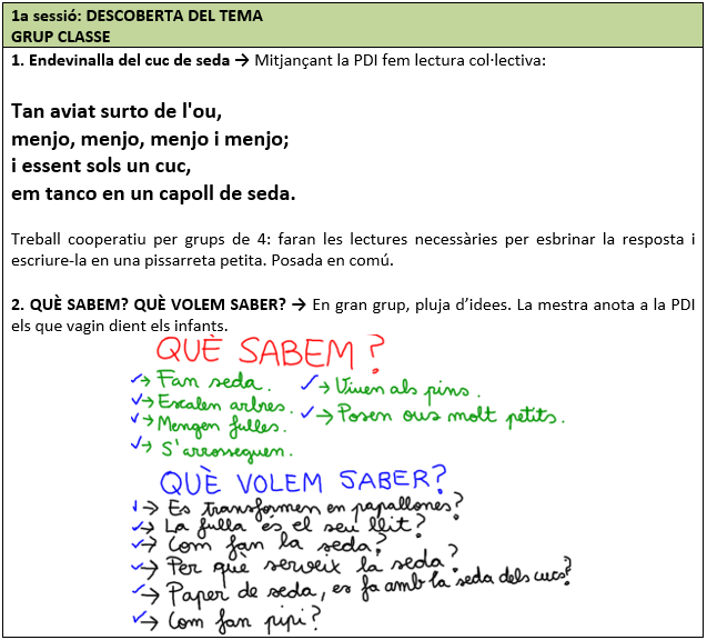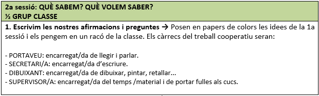 -Tractament de la informació: posada en comú entre els membres del grup i elaboració dels petits textos que resumien de forma adequada a la seva edat el que havien après.
