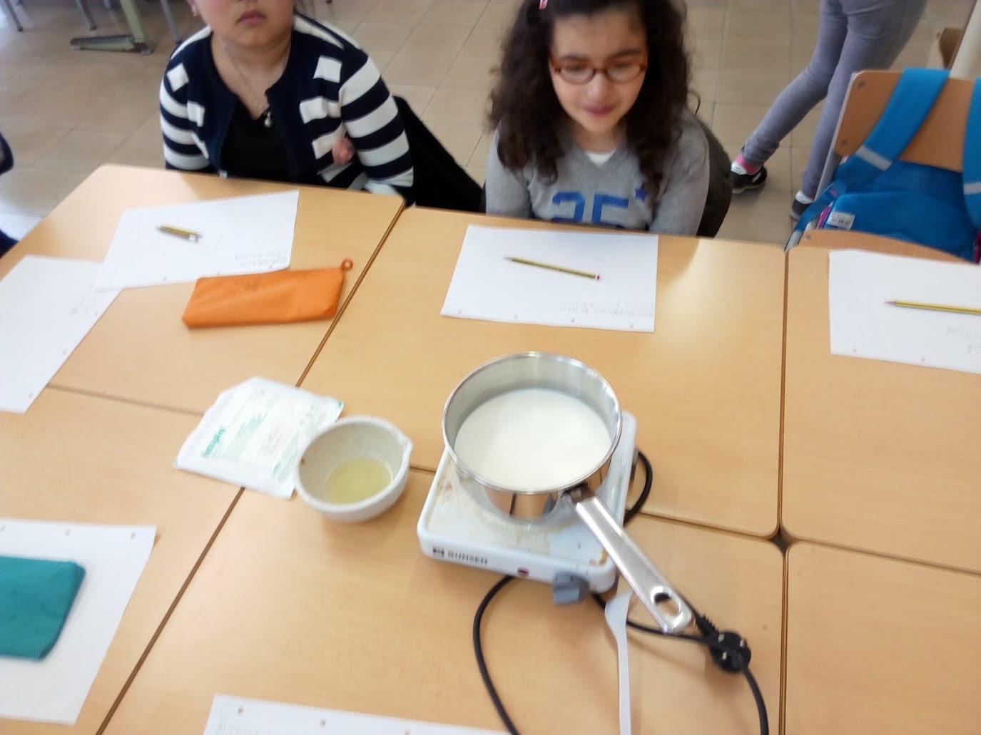 Per poder entendre com es desfà i canvia d’estat l’aliment quan entra en contacte amb els àcids gàstrics vam fer un simulacre a partir d’un experiment fet amb llet, llimona i una font de calor (foguer). Vam poder observar el canvi químic que es produeix i així imaginar-nos-el dins l’estómac. Per fer-ho amb el màxim de rigor, vam mesurar les quantitats que fèiem servir durant tot el procés.