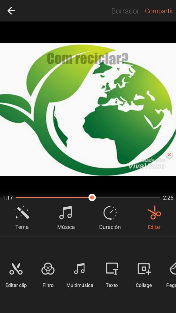És una aplicació molt senzilla i intuitiva d’utilitzar. Permet fer vídeos amb la càmara, editar vídeos, muntar vídeos amb fotografies, fer musicals, selfies i collages. Jo he utilitzat l’opció de muntar un vídeo a partir de fotografies basat en el reciclatge. El vídeo consta de 3 parts: els tipus de residus, com reciclar i l’impacte dels residus al medi ambient i al principi de tot et dóna l’opció d’escollir quin tipus de introducció i final vols, la música de fons, el volum d’aquesta, etc…