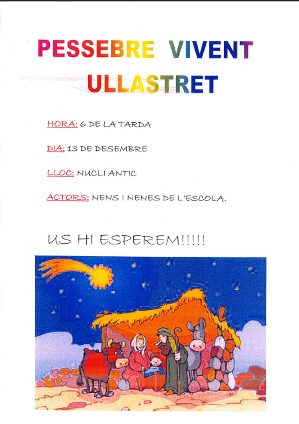 Dins de les activitats previstes a les nostres escoles per aquest Nadal, demà divendres, 13 de desembre, tindrà lloc la representació del Pessebre Vivent d’Ullastret a càrrec dels nens i nenes de l’escola L’Estany. Serà a les 18’00 hores per tot el casc antic del poble. Acontinuació es farà una cantada de nadales al centre cívic.
