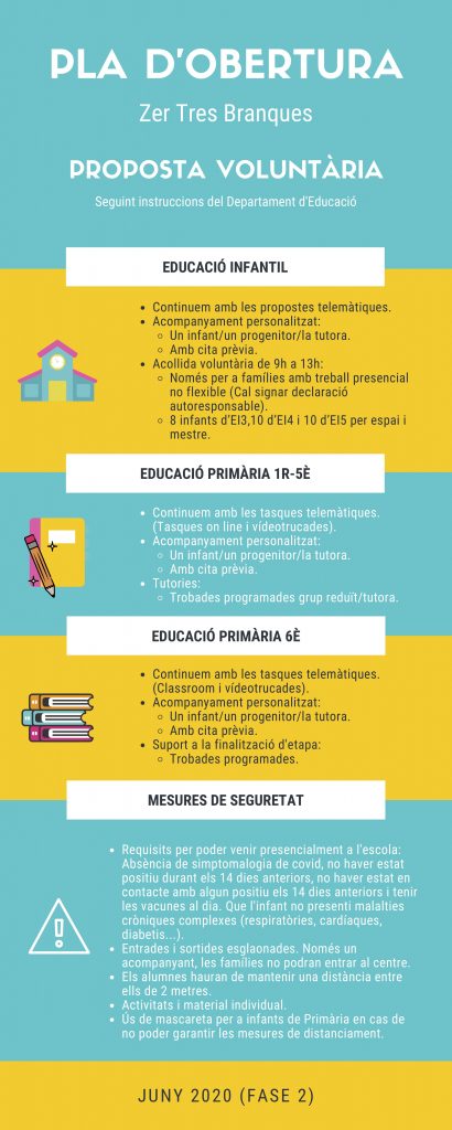 A continuació us mostrem la infografia on es detalla el Pla d’obertura de centre tenint en compte les instruccions del Departament d’Educació.